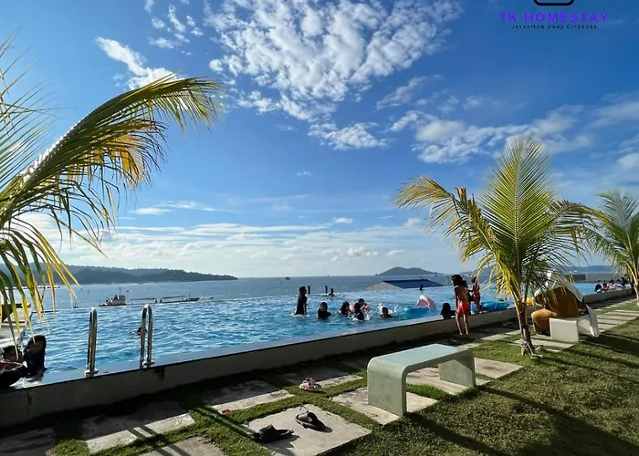 O Tk Homestay - Sea View And Mount Kinabalu View Kota Kinabalu oferece quartos com vista para o mar e localização a 25 minutos a pé de Karamunsing Capital. Situado com fácil acesso para de Terminal Marítimo de Jesselton, este apartamento dispõe de piscina ao ar livre para o uso dos hóspedes.